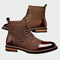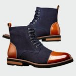 Férfi **bőr cipők fűzővel** elegáns sötétkék és barna kombinációban, amelyek örök eleganciát sugároznak. A fényes barna orr- és sarokvég prémium jelleget kölcsönöz, míg a **tartós talp** stabil lépést biztosít. Ideális választás üzleti casual, de formális alkalmakra is.