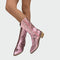 Női **cowboy cipők fényes rózsaszín** színben, amelyek egyedi stílusukkal vonzzák a tekinteteket. Gazdag hímzett mintázattal rendelkeznek, és oldalsó cipzárral könnyen felvehetők, míg az alacsony fa sarok kényelmet és stílust kínál minden lépésnél. Ideálisak merész street-style megjelenésekhez és divatos eseményekhez, amelyek kiemelkednek.
