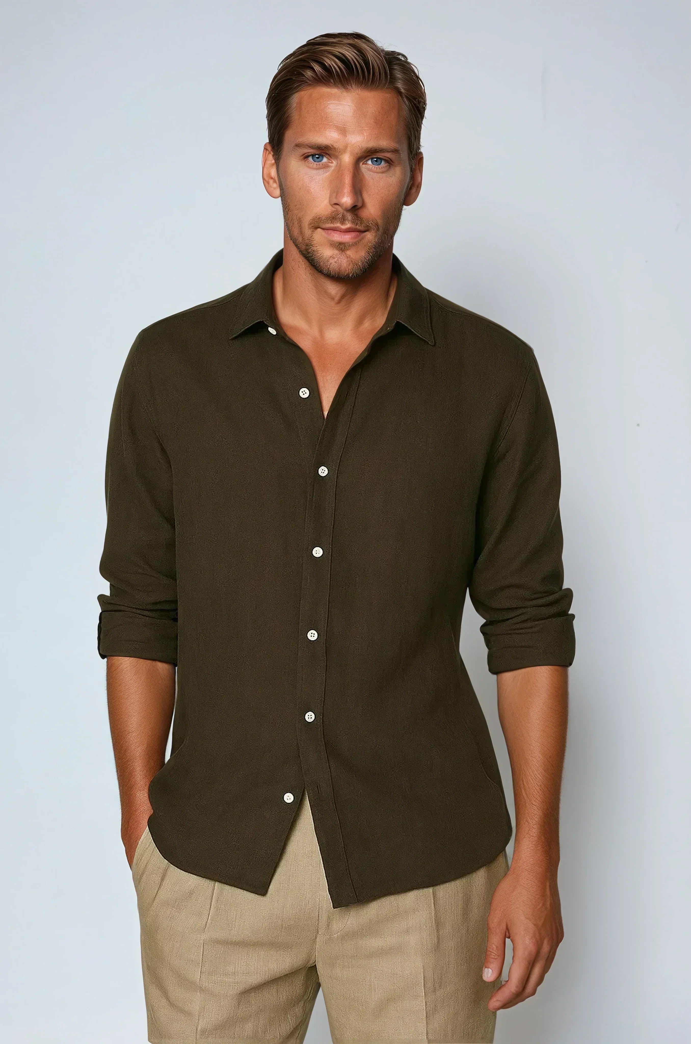 Fedezze fel a Grand Arbre Sötétbarna Len Ingjének kifinomult stílusát. Ez az elegáns ing ötvözi a kényelmet, a luxust és egy univerzális színt, amely ideális olyan férfiak számára, akik olyan ruhadarabot keresnek, amely egyszerre stílusos és légies. Tökéletes bármilyen alkalomra, a hétköznapitól a félformálisig.